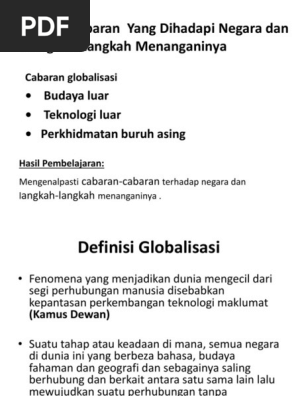 Mahathir Mohamed sewaktu beliau menjadi Perdana Menteri Malaysia mengenai dunia globalisasi terdapat sebanyak lima cabaran asas terhadap dunia globalisasi seperti yang dilihat menerusi rajah di bawah. 23022014 CABARAN GLOBALISASI DALAM PENDIDIKAN Menerusi pandangan bekas Perdana Menteri kita Tun Dr. GCI 1022 CABARAN PERTAHANAN DAN KEDAULATAN NEGARA Pensyarah.