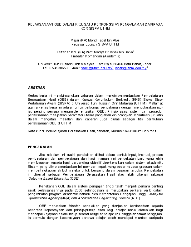 Doc Pelaksanaan Obe Dalam Kkb Satu Perkongsian Pengalaman Daripada Kor Sispa Uthm Mohd Fadel Academia Edu